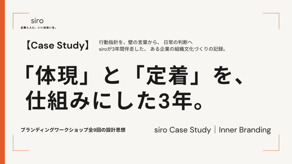 ※本記事は、siroがクライアント企業で3年にわたって伴走しているインナーブランディング研修の実施記録をもとに構成しています。クライアント企業名は記事の性質上匿名としていますが、内容は実際のプログラム設計と運用に基づくものです。